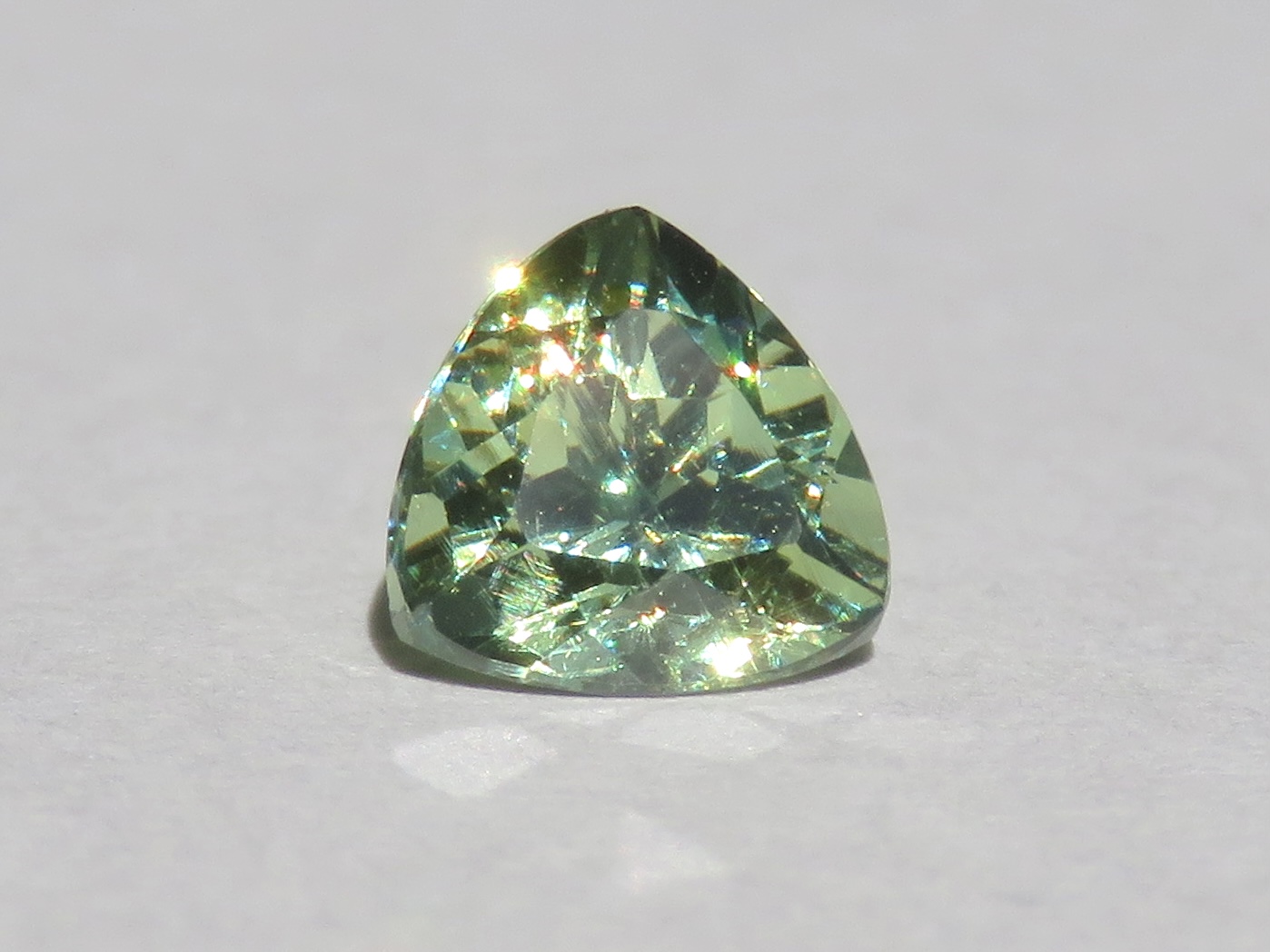 色調は、黄緑~緑色で、ダイヤモンドを凌ぐ高い分散率による見事な煌きとファイアーが魅力です。