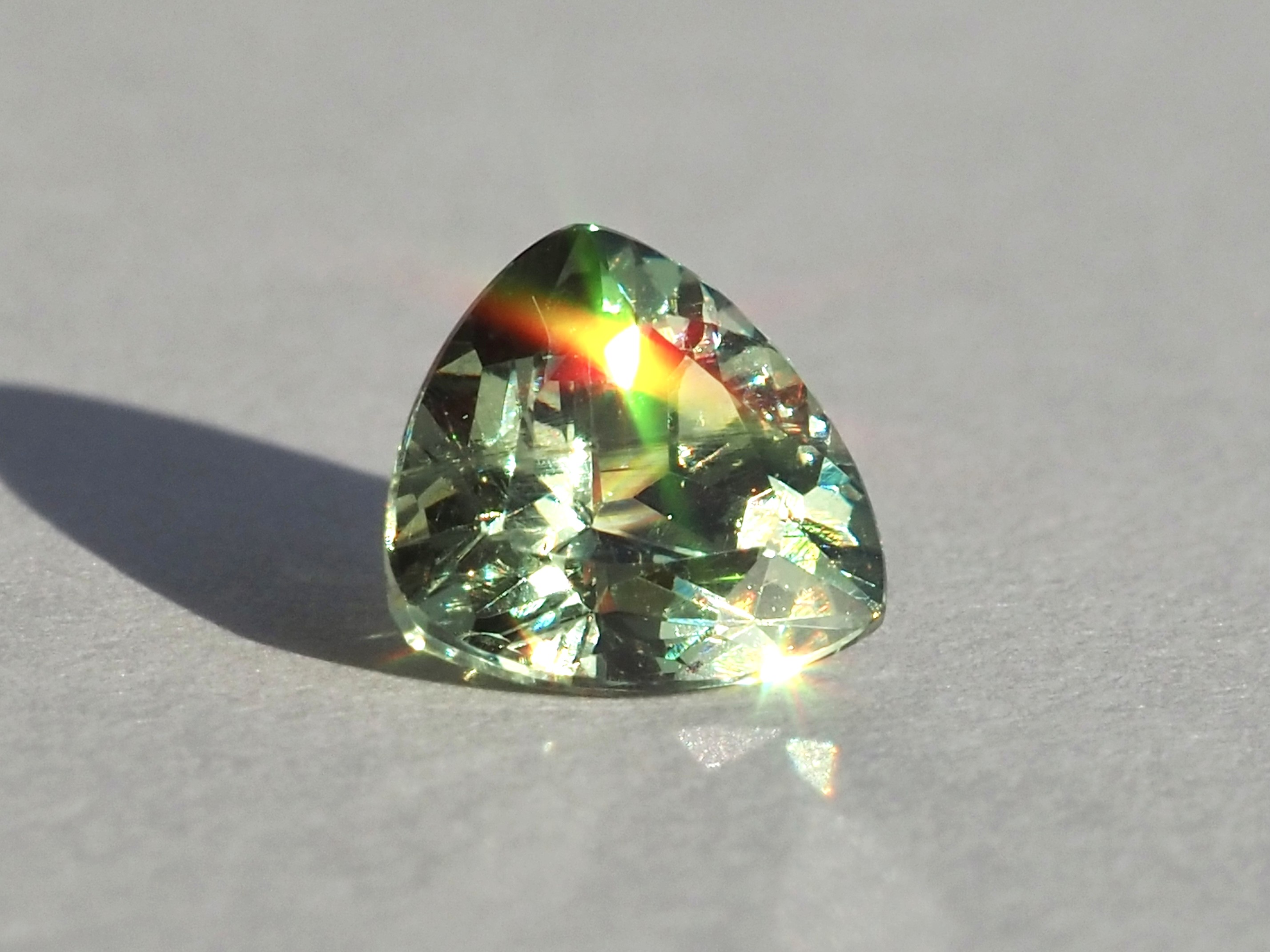 色調は、黄緑~緑色で、ダイヤモンドを凌ぐ高い分散率による見事な煌きとファイアーが魅力です。