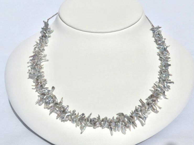 特色ある商品で、尖った真珠もある為、多少肌触りが気になる事があるかもしれませんが、最も肌に当たる首の後ろ部分はチェーンにいたしております。