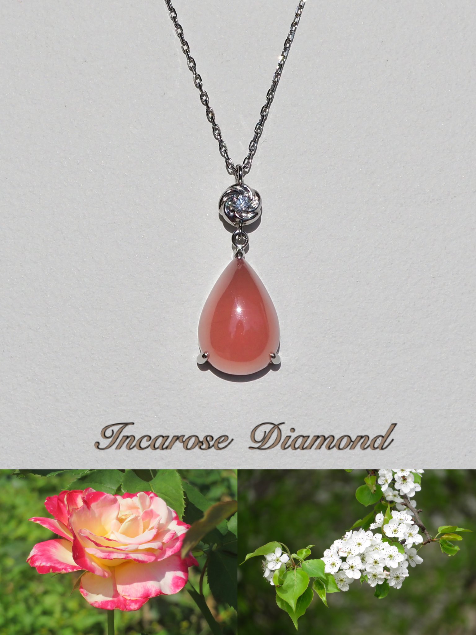 「インカの薔薇」と呼ばれるつゆ型のインカローズの上には、氷河期からの生き残りと言われます「マメナシ」の蕾が開きかけたデザインのバチカン(チェーンを通す部分)をジョイントし、中心にはダイヤモンドをセッティングいたしました。
