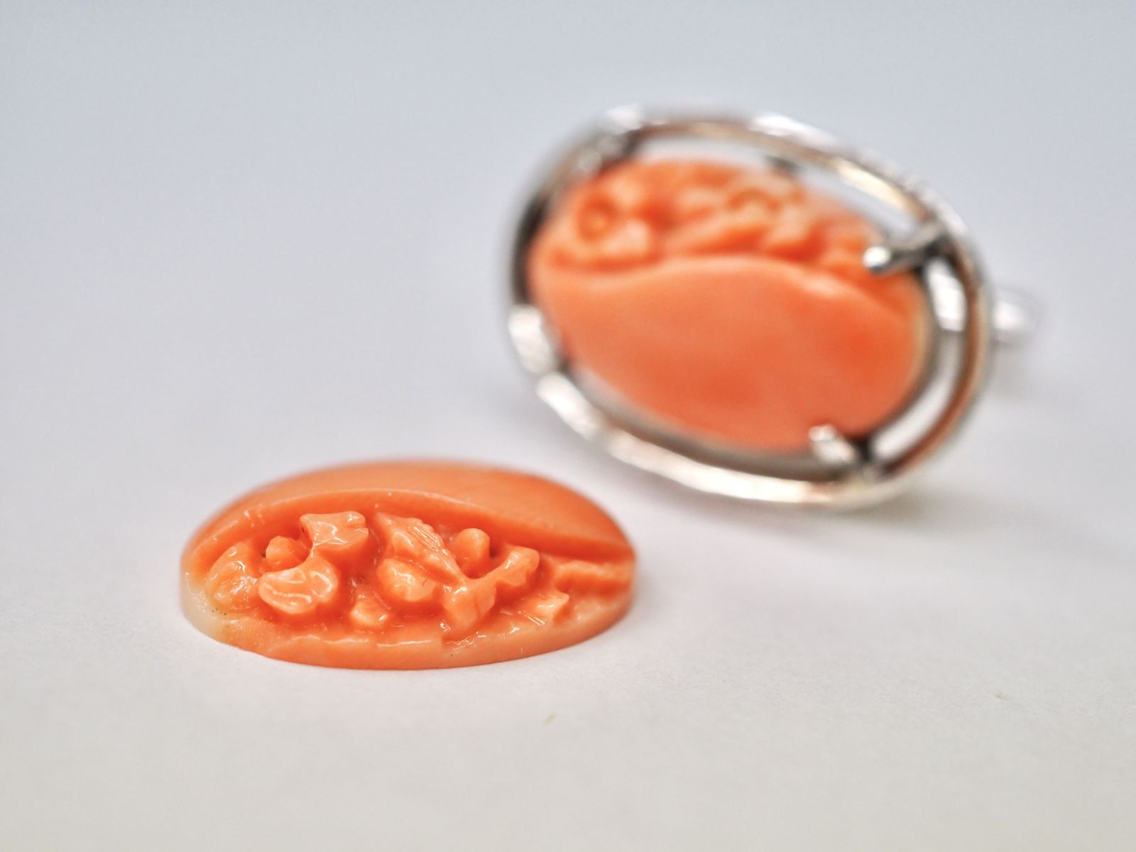 お客様がお持ちの片方はカフス、もう片方はルース(裸石)のお花が彫刻されました珊瑚に、パライバトルマリンを追加し、プラチナ製の新たなカフスへとジュエリーリフォームさせて頂きました。
