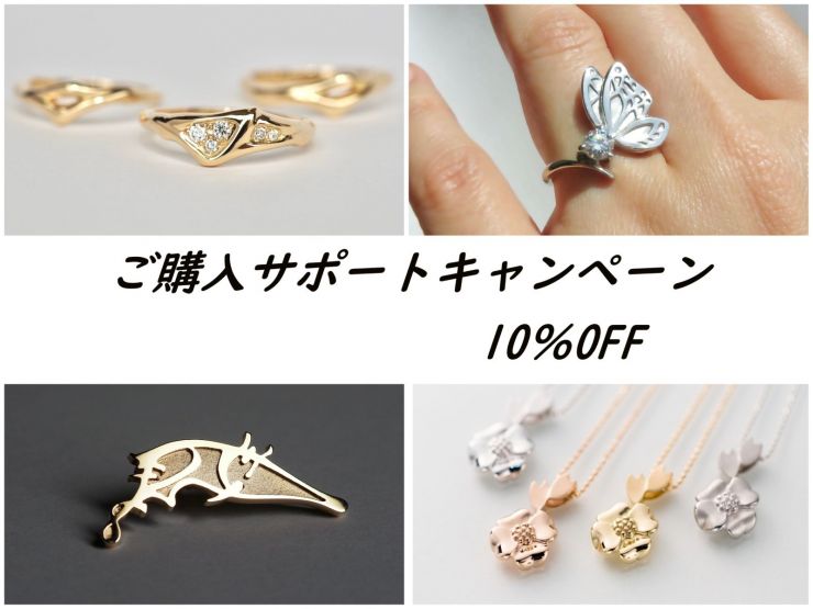 当店におきましても、店頭とオンラインショップにて販売中の商品につきまして、地金価格の相場変動に伴い、定期的な価格改正をさせて頂いておりますが、少しでも商品のご購入をご検討頂いております皆様へのサポートになればと考え、この度「ご購入サポートキャンペーン」を実施させて頂く事と致しました。