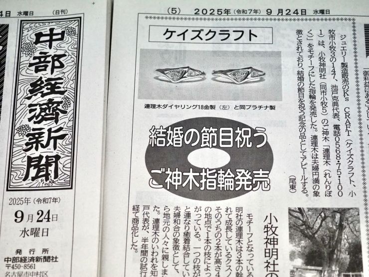 中部経済新聞さんに「連理木リング」について取材を頂き、9/24の紙面にてご紹介頂いております。